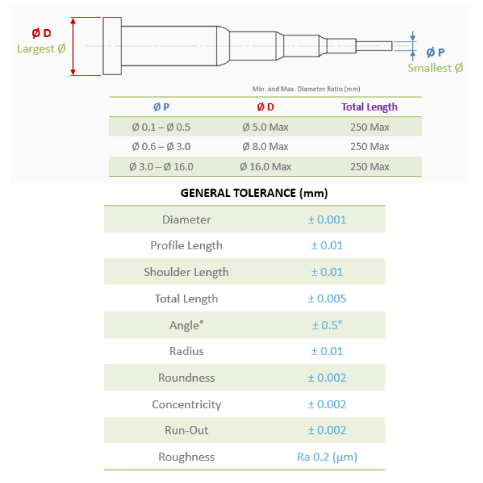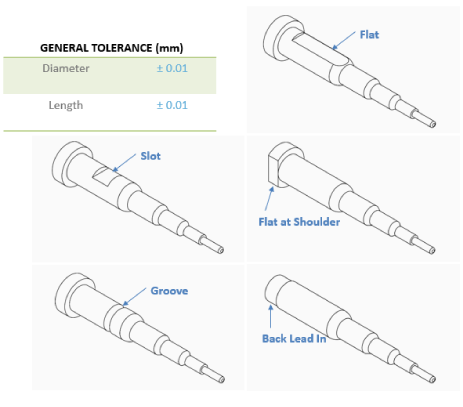 KLC PRECISION is capable of producing various custom-made round pins and punches in materials of carbide and high-speed steel from diameter 0.025mm(0.001”) to 16mm (0.63”) at the length up to 250mm (9.8”) long. Length/diameter ratios of up to 400 can be grounded with concentricity and roundness in the area of 1μm (0.00004”). With our expertise, we offer a precision line of Pins and Punches.